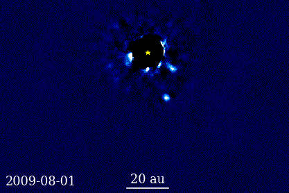 Dies ist jedoch durch die grosse Leuchtkraft eines Sterns und die vergleichsweise geringe Helligkeit seines Planeten sehr schwierig und nur bei sehr grossen Planeten und grossem Abstand zu ihrem Stern bisher möglich ist. Wie auch hier in diesem Beispiel von dem System HR 8799 mit seinen vier Planeten, die weitaus grösser sind als unser grösster Planet Jupiter, aber nur sichtbar sind, wenn man den Stern in der Mitte abdeckt.