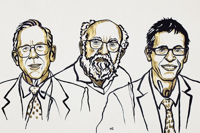 Für die Entdeckung des ersten, um einen Stern kreisenden Exoplaneten erhielten Michel Mayor und Didier Queloz gemeinsam mit James Peebles 2019 den Nobelpreis in Physik! (Bild Copyright © Nobel Media 2019. Illustration: Niklas Elmehed.) Im Mai 2025 durften wir Nobelpreisträger und inzwischen Gründer und Direktor des Center for Origin and Prevalence of Live an der ETH Zürich Didier Queloz im Planetarium begrüssen - mehr über dieses Event findet man hier!