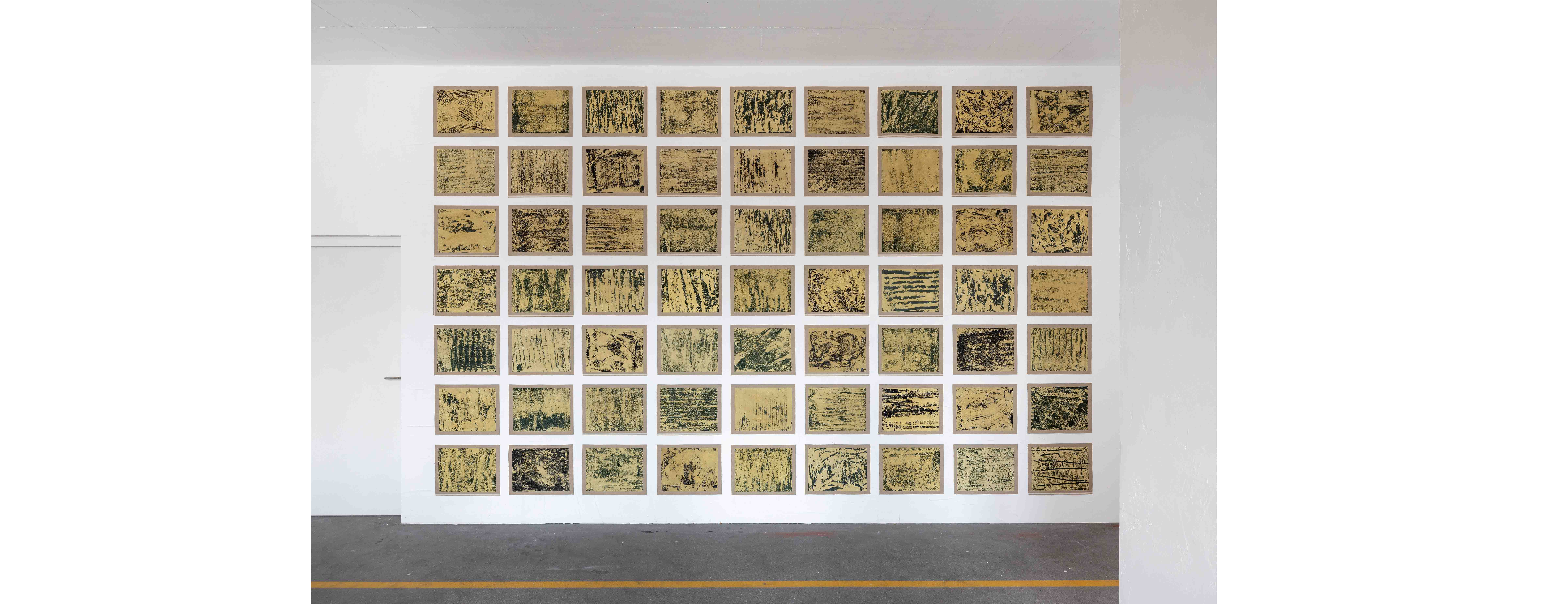 Sven Egert (* 1980); Anima mundi, 2024, 63 Tafeln: eingefärbter Bauschaum und Acryl auf Rohgewebe-Leinen