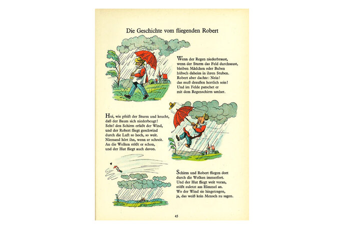 Bildlegende: Der fliegende Robert, aus: Der Struwwelpeter. Erste Schweizer Ausgabe, neu bearbeitet nach Vorlagen von Dr. H. Hoffmann, hrsg. von J. K. Schiele, Zürich: Globi Verlag, 3. Auflage 1947, Privatbesitz
